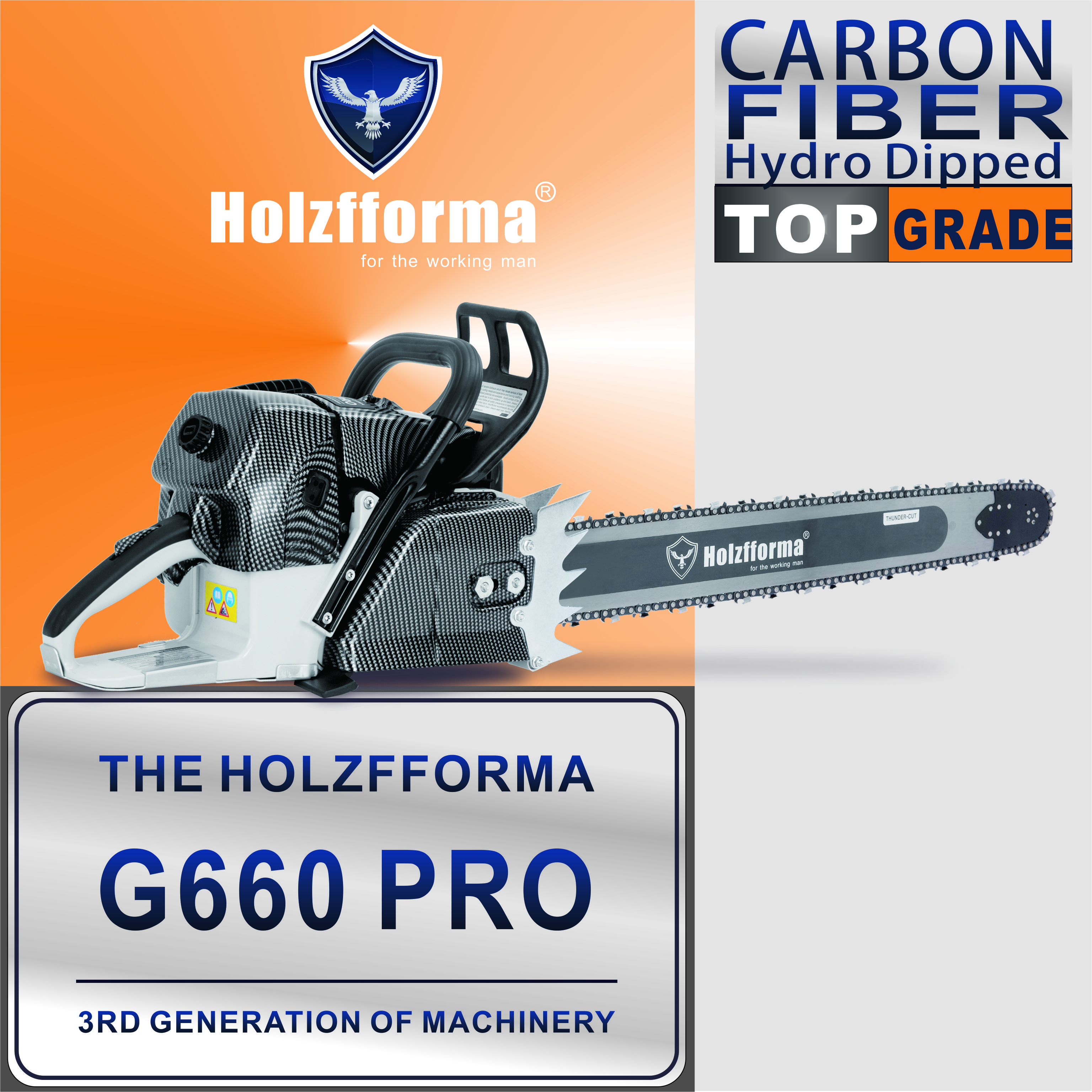 92cc Holzfforma G660 PRO Top Grade Chainsaw Power Head With Walbro Carburetor Italy Tech Nikasil Cylinder Meteor Piston Caber Ring NGK Plug Tank Protective Guard Larger and Stronger Sprocket Cover